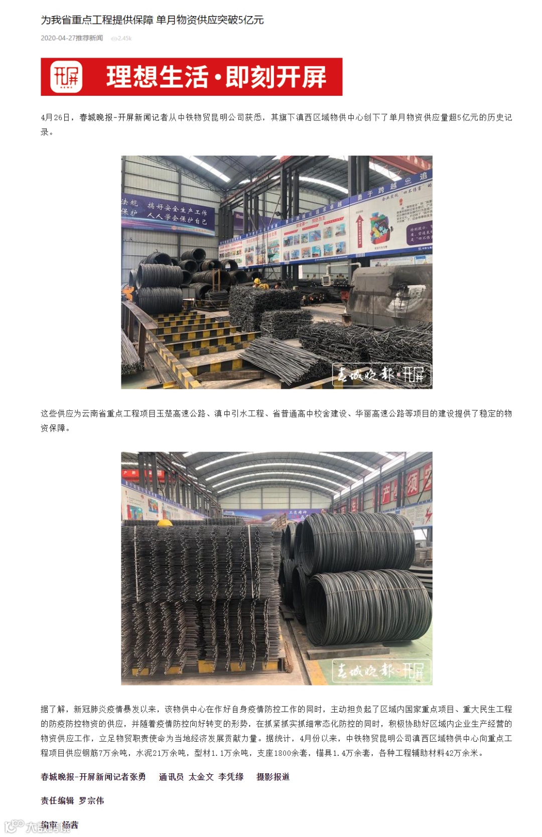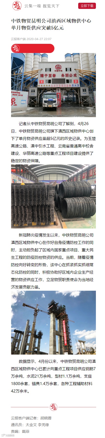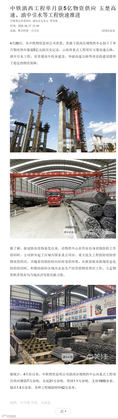 记者从中铁物贸昆明公司了解到,4月26日,中铁物贸昆明公司旗下滇西区域物供中心创下了单月物资供应量超5亿元的历史记录。为玉楚高速公路、滇中引水工程、云南省普通高中校舍建设、华丽高速公路等重点工程项目建设提供了稳定的物资保障。