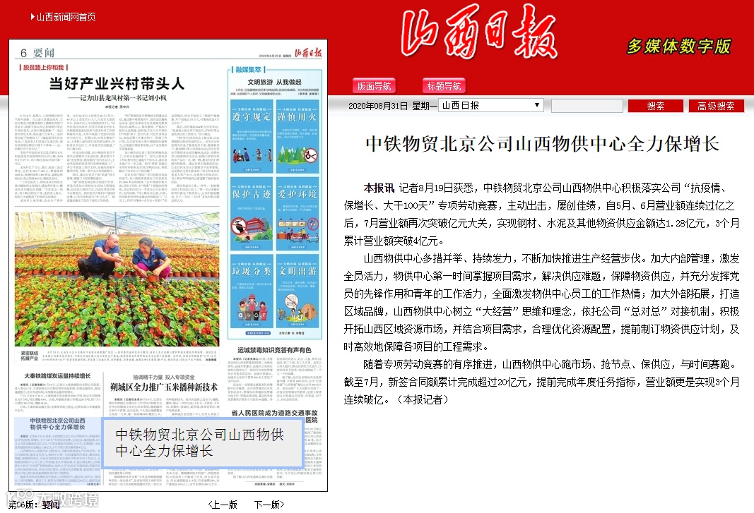 本报讯 记者8月19日获悉,中铁物贸北京公司山西物供中心积极落实公司“抗疫情、保增长、大干100天”专项劳动竞赛,主动出击,屡创佳绩,自5月、6月营业额连续过亿之后,7月营业额再次突破亿元大关,实现钢材、水泥及其他物资供应金额达1.28亿元,3个月累计营业额突破4亿元。