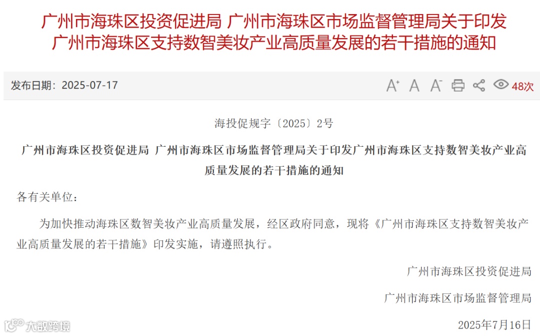 近日,《广州市海珠区支持数智美妆产业高质量发展的若干措施》正式印发,政策围绕数智化改造、数据应用创新、研发创新、品牌出海、人才服务等方面给予资金奖励与服务保障,为区内符合条件的美妆企业创新扶持机制,激发区域美妆产业高质量发展。