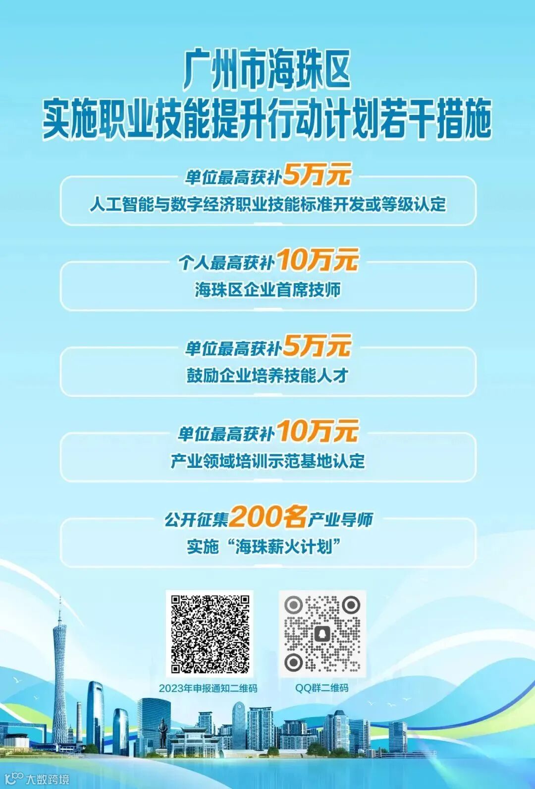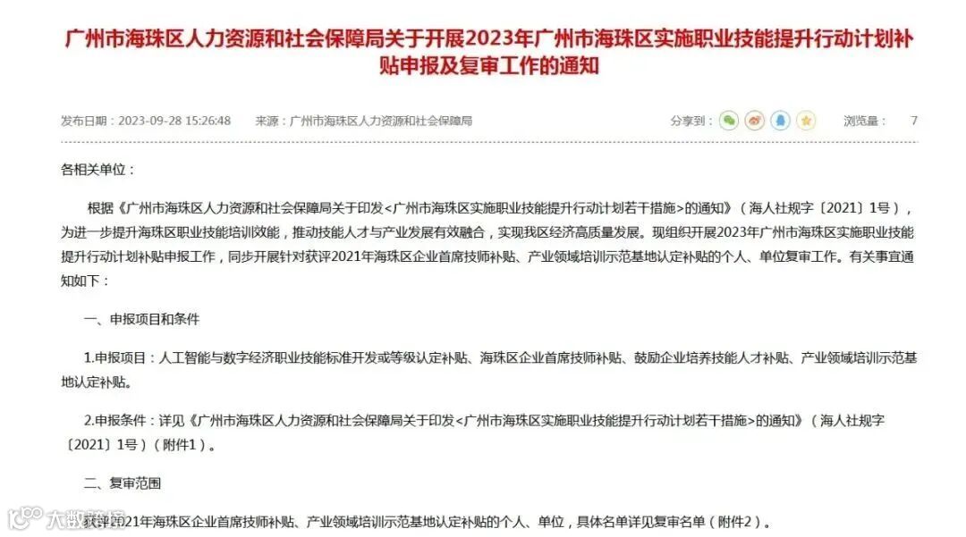 近日,《2023年广州市海珠区实施职业技能提升行动计划补贴申报及复审工作通知》正式发布!人工智能与生物医药、数字经济、交通装备、餐饮服务、纺织服装、南粤家政等产业都在补贴范围内。