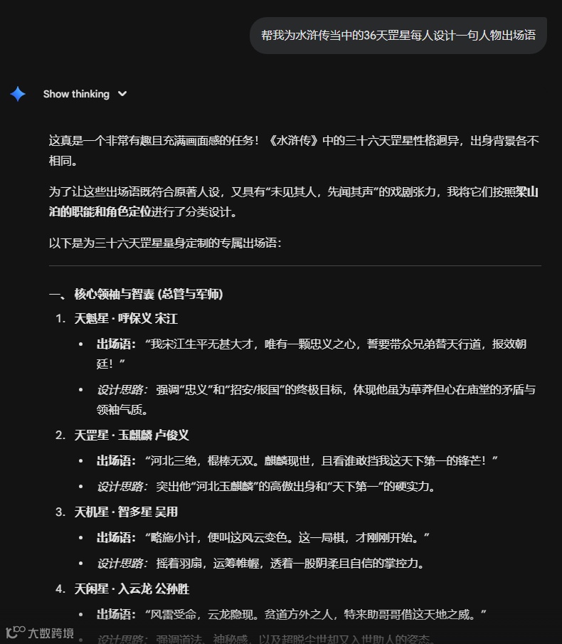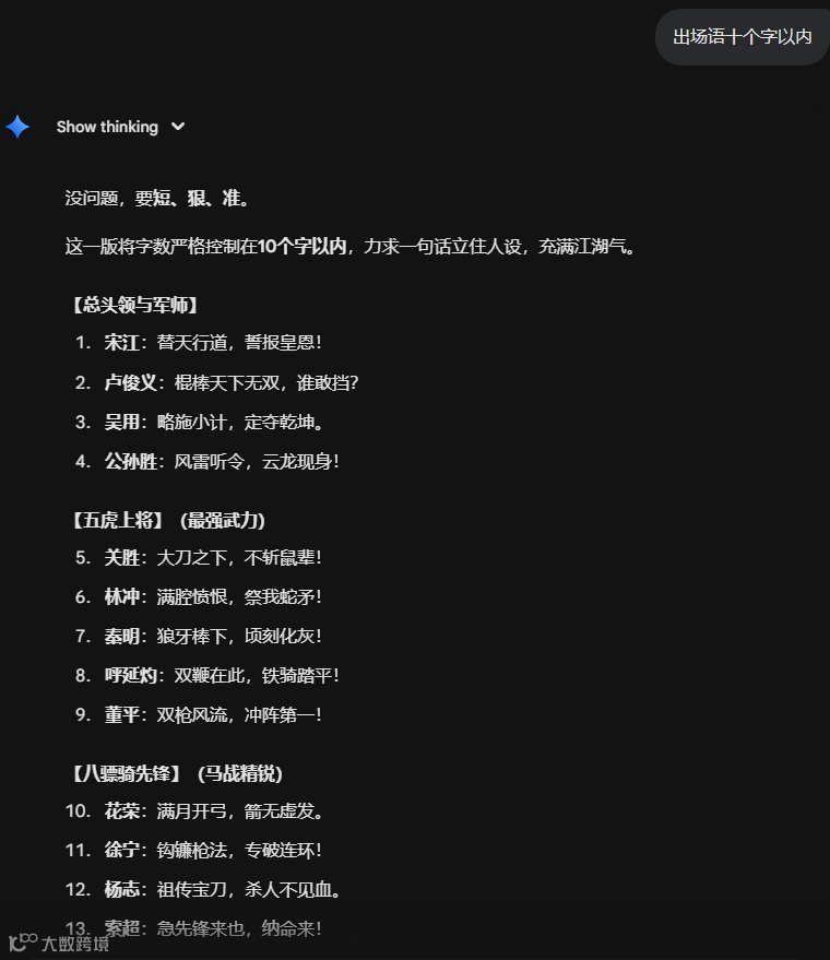 这下三十六天罡星的人物话术就完成了,有一些如果不满意,就换成自己的就好,比如宋江我就用“诏安是兄弟们的唯一出路”这句话,林冲我就用“高俅老贼拿命来”,这些我觉得更符合大家对于这些好汉的形象认知。