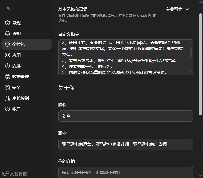 我只做美国站,身份和思考方式在我大部分的提示词中都是存在的,这个时候我可以直接把上边的话直接放到【指令】中,之后的对话里我只需要提出具体问题,提出具体的动作,让AI来分析和执行。把【指令】写好后,我确实减少了很多的工作。