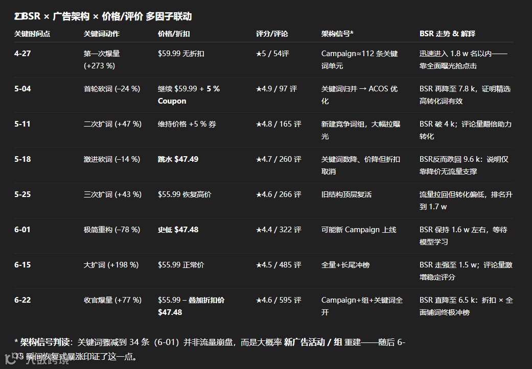 为了尽可能更全面了解竞品,我一般会拉类似keepa的数据(SIF、卖家精灵、鸥鹭都可),再加竞品的广告架构数据(拉一年的数据,数据量很大)。主要是为了研究订单、流量二者之间的关系。