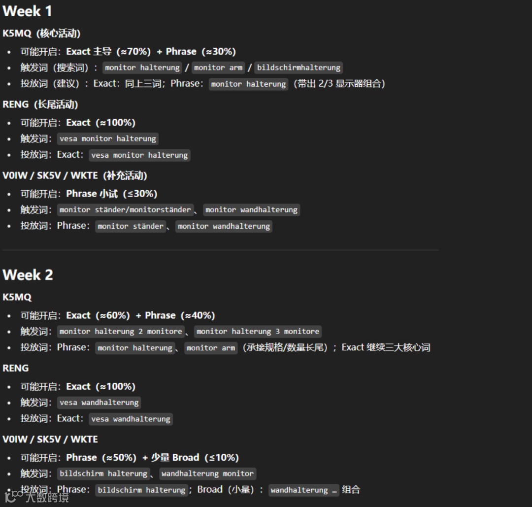 广告分析的方法如法炮制。把数据丢给AI,再结合知识库,能大致做到哪个广告活动开启什么匹配模式,投放哪些关键词匹配出什么关键词。关键还是批量判断,还有数据留存,方便后续重新再看一次,自己弄的话时间很长,下图GPT花了五分钟左右处理的,部分节选,回复了大概几千字的分析。
