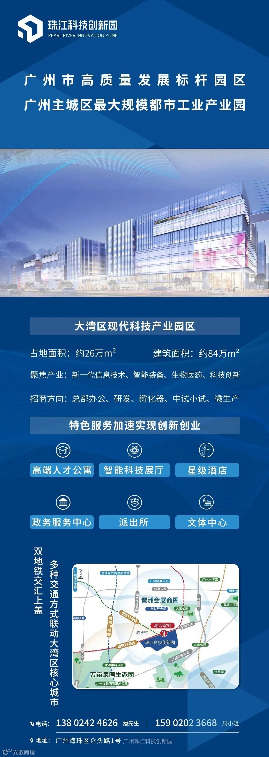珠江科技创新园位于广州市海珠区新滘东路以南,仑头路以西路段,紧邻万亩果园、海珠国家湿地公园,北临琶洲会展商圈,西面紧靠海珠区政府及中大纺织城。园区总建设用地面积约26万㎡,总建筑面积约84万㎡,计划总投资77亿元。园区是海珠区现存最大规模,也是广州中心城区面积最大的都市工业产业园。2022年被评为“广州市高质量发展标杆园区”。园区享受广州市高质量发展标杆园区及海珠区都市工业园区专项扶持政策。