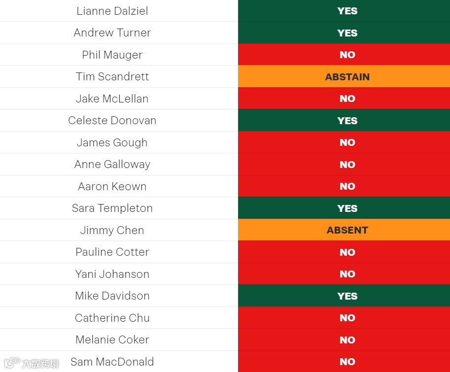 市长 Lianne Dalziel、副市长 Andrew Turner 和议员 Mike Davidson、Sara Templeton 和 Celeste Donovan 投了赞成票。议员 Jimmy Chen 缺席,议员 Tim Scandrett 弃权。