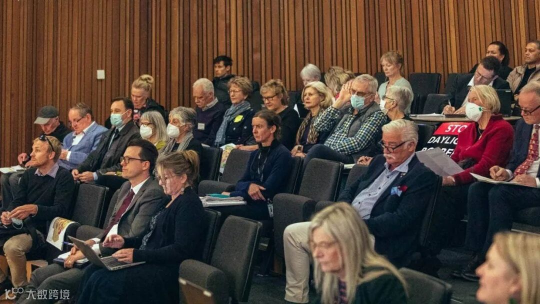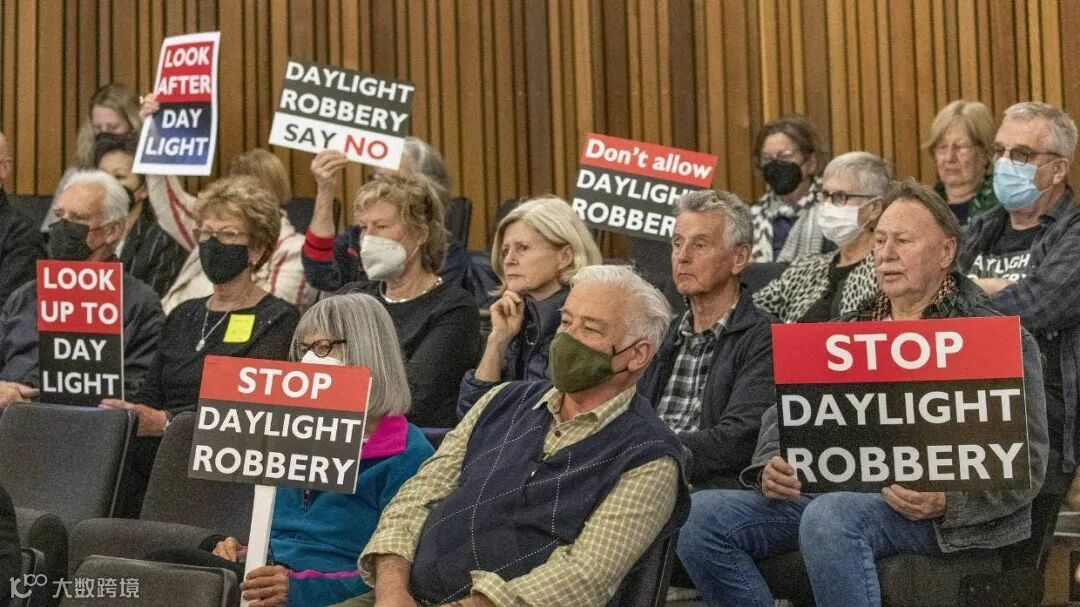 周四在议会会议厅讨论这个问题时,一些抗议者穿着 T 恤或举着标语:“Stop Daylight Robbery”。