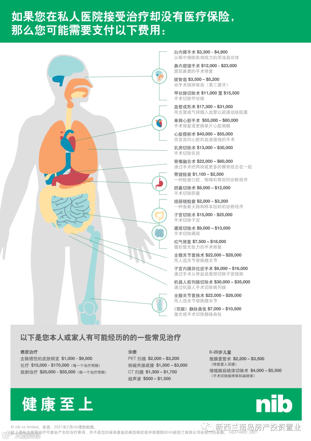 在新西兰,ACC可以在人们意外受伤时提供大部分的诊治费用。公立医疗系统可以为享受公费医疗的人士免费医疗。但由于ACC和公立医疗系统在保障范围、资源数量、治疗方案和诊疗效率上有较大局限,人们往往需要使用私立医疗系统才能得到更及时、更舒适、资源更丰富和选择性更多样的医疗服务,还能使用到公立医院中使用不到的新上市的高效“神药”(non-pharmacdrugs)。然而,私立系统的医疗服务价格昂贵(下附常见诊疗费用表),成千至数十万纽币的医疗费用让多数人望而却步。这时,医疗保险的作用就显现出来了。
