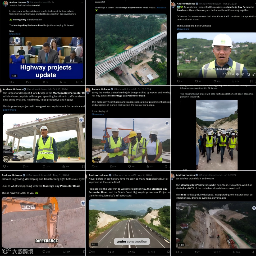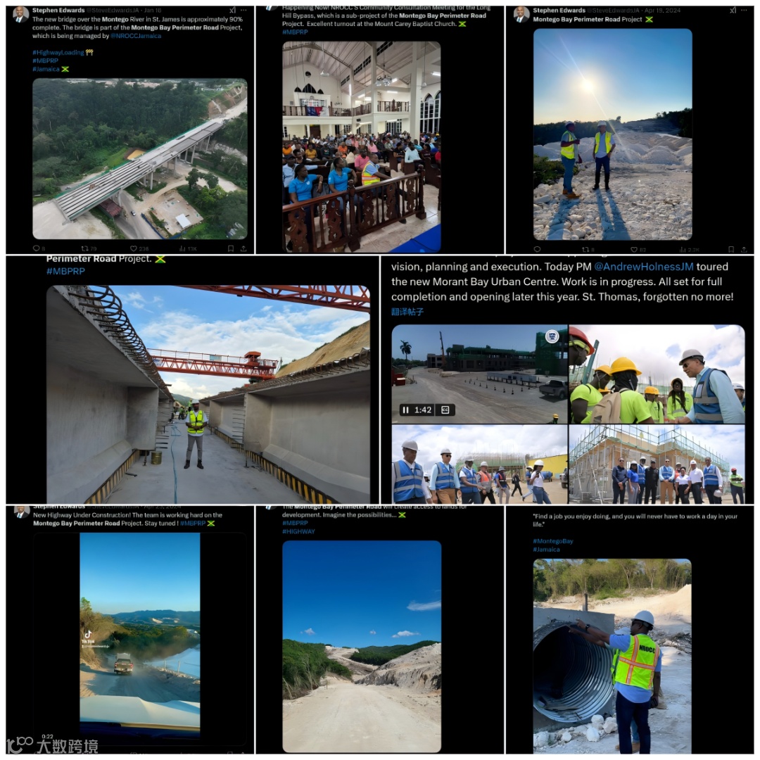 2024年,牙买加国别项目总经理部各项目在各方的共同努力与关注下,取得了显著进展。总统Andrew Holness与国家公路运营建设部(NROCC)部长 Stephen Edwards ,一年间累计通过 “X” 社交应用发布牙买加蒙特哥贝绕城路项目以及牙买加莫兰特湾市政综合体项目的施工进度、分享亲临施工现场考察调研的动态与行程累计多达17次。