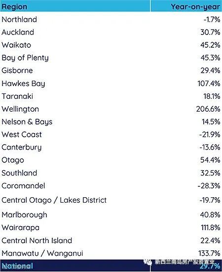 四个地区的住房存量同比增长一倍以上——惠灵顿(增长 206.6%)、马纳瓦图/旺格努伊(增长 133.7%)、怀拉拉帕(增长 111.8%)和霍克斯湾(增长 107.4%)。其他地区,包括奥塔哥(上涨 54.4%)、丰盛湾(上涨 45.3%)、怀卡托(上涨 45.2%)和南地(上涨 32.5%),库存显着增加。