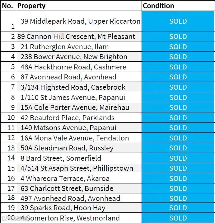 以上数据仅为Harcourts公布的其中位于基督城的三家分部的Auction Results(拍卖时间为13-19/03)。数据持续更新,敬请期待!