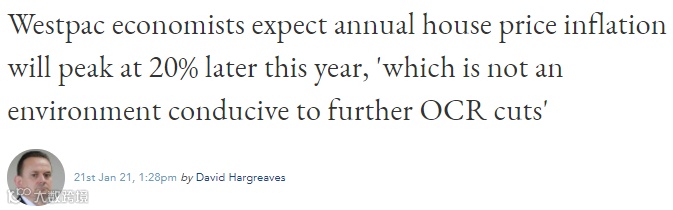 事实上,西太平洋银行的首席经济学家dominic Stephens预测房价通胀将达到20%的峰值(之前的预测值是16%),他认为飙升的房价是他今年不再两次下调OCR的重要原因。“我们预计年度房价通胀将在今年晚些时候达到20%的峰值,这不利于进一步削减OCR,” Stephens在OCR预测更新中表示。