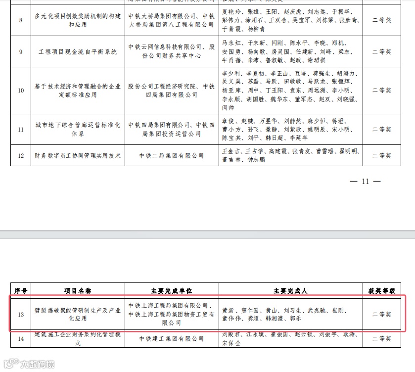 1月10日,股份公司发布了《关于表彰中国中铁第四届实用技术创新大赛获奖成果的决定》,物贸公司新型材料事业部完成的“劈裂爆破聚能管研制生产及产业化应用”实用技术获技术创新大赛(软科学类)“二等奖”,这是物贸公司首次获得此类荣誉。