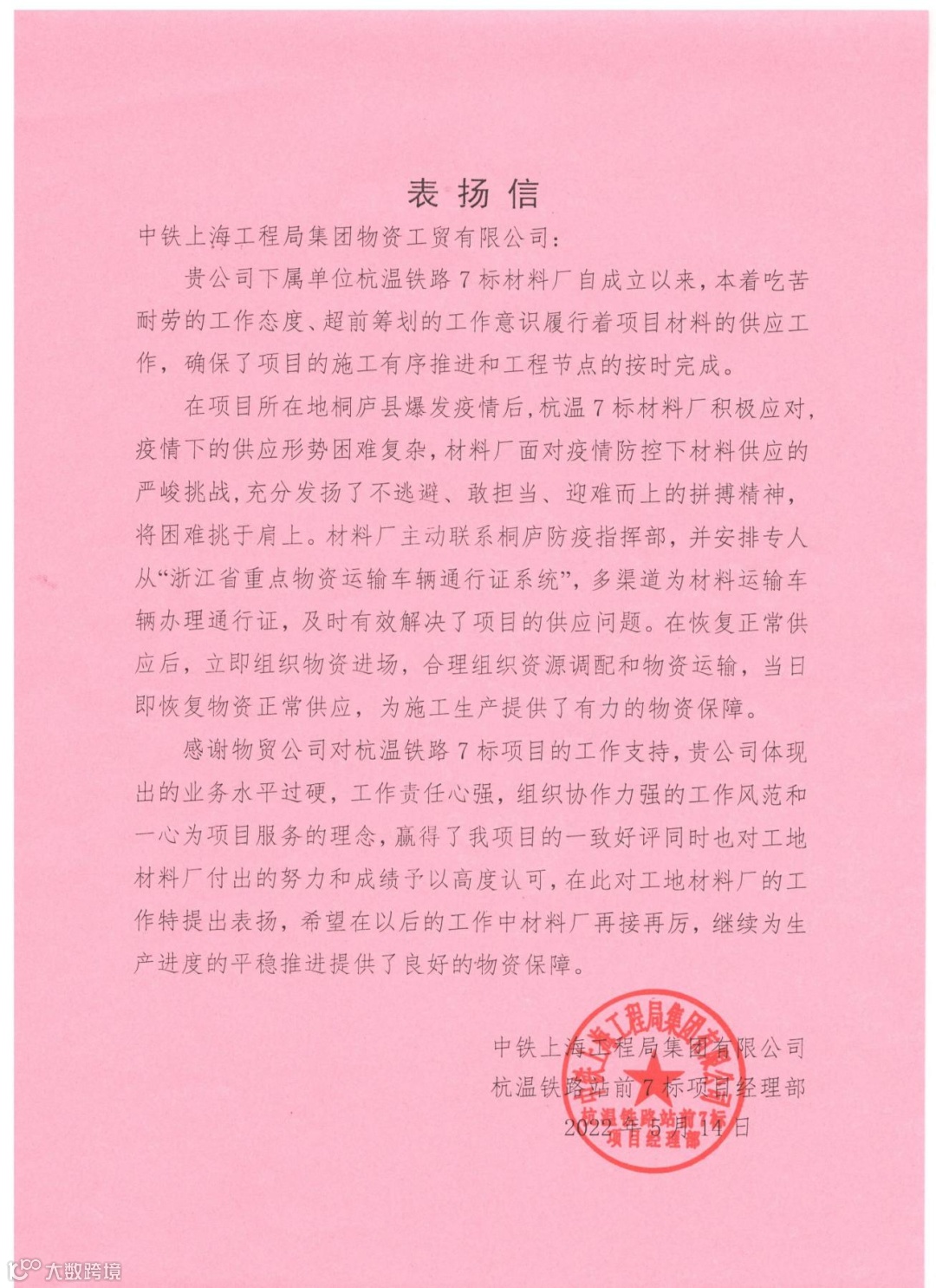 5月初,杭温7标材料厂所在的杭州市桐庐县出现新冠疫情确诊病例。疫情的发生意味着整个城市的交通运输、施工生产随时会被按下“暂停键”。杭温7标材料厂反应及时,在桐庐疫情期间攻坚克难,精心筹措,有效保证了项目的物资供应,极大降低了项目断供停工的风险,为项目的施工推进付出巨大努力。