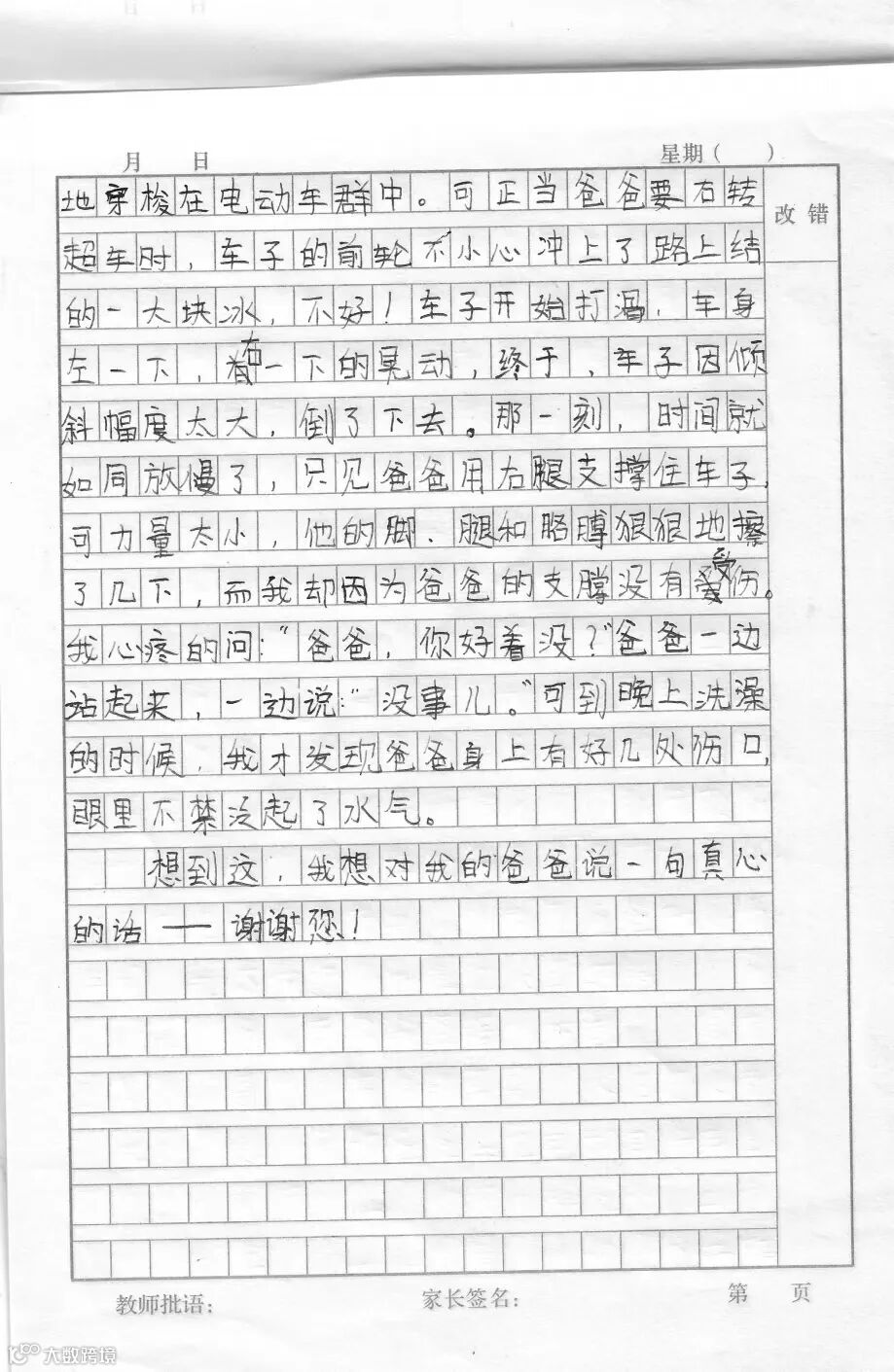 我的爸爸更是我坚强的护盾。记得那是一个寒冷的早晨,太阳还没有从东方升起,爸爸用电动自行车送我上学,风吹过我们的脸,如同一把把刀,利剑刺入我们的脸,路上也很滑。我和爸爸艰难的穿梭在电摩大军中。可正当爸爸要右转超车时,车子的前轮不小心冲上了路上结的一大块冰,不好,车子开始打滑,车身左一下,右一下的晃动,忽然,车子因倾斜幅度太大倒了下去。那一刻,时间就如同放慢了,只见爸爸试图用右腿支撑住车子,可力量太小,他的脚、腿和胳膊狠狠地在地上擦了几下,身体却护着我的身子,而我却因为爸爸的支撑没有受到任何伤。我心疼的问:“爸爸,你好着没?”爸爸一边站起来,一边说:“没事儿”。后来便继续骑上了车子,送我到了学校。时间到了晚上,我喊爸爸咱一块去洗澡吧,爸爸开始不洗,我说走吧,我给你搓背。硬拉着爸爸进了洗澡间,洗澡的时候,我才发现爸爸身上有好几处伤口,眼里不禁的泛起了水汽,眼泪不停地在眼眶里打转。
