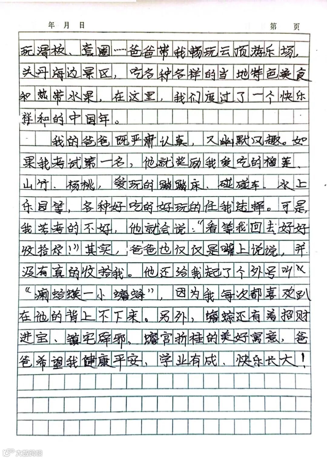 我的爸爸既严肃认真又幽默风趣。如果我考试第一名,他就奖励我爱吃的榴莲、山竹、杨桃,爱玩的蹦蹦床、碰碰车、水上乐园等,各种好吃的好玩的任我选择。可是我若考的不好,他就会说:“看等我回去好好收拾你!”,其实爸爸也仅仅是嘴上说说,并没有真的收拾我。他还给我起个外号叫“瘌蛤蟆-小蟾蜍”,因为我每次都喜欢趴在他的背上不下来,另外蟾蜍还有着招财进宝、镇宅辟邪、蟾宫折桂的美好寓意,爸爸希望我健康平安、学业有成、快乐长大!