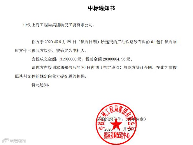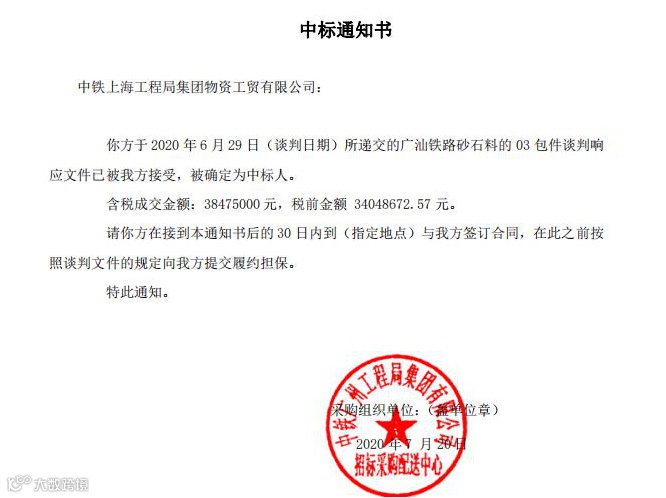 物贸公司中标中铁广州局广汕铁路碎石供应项目