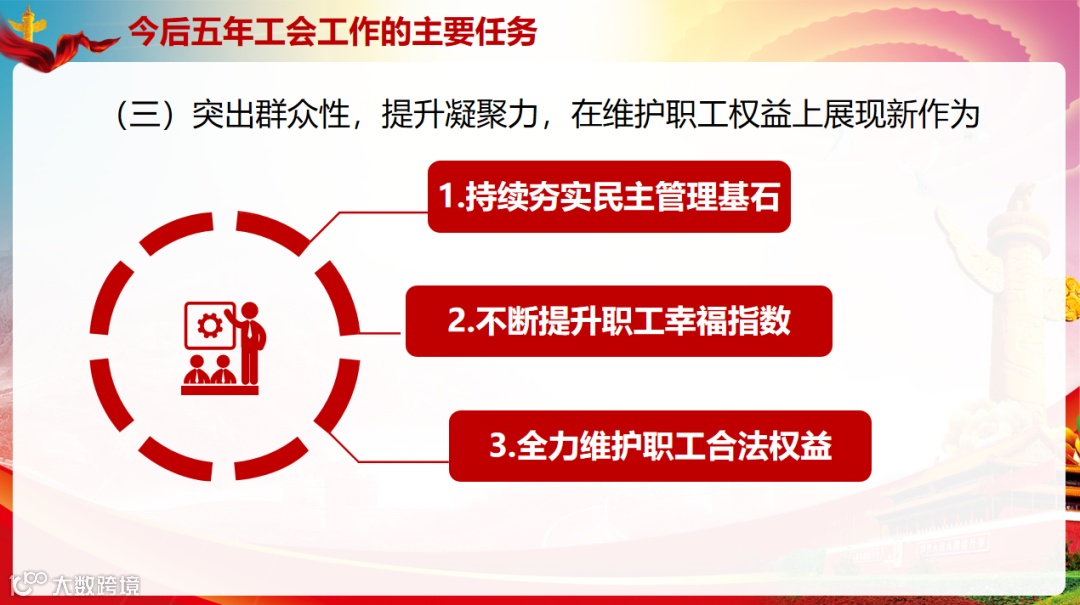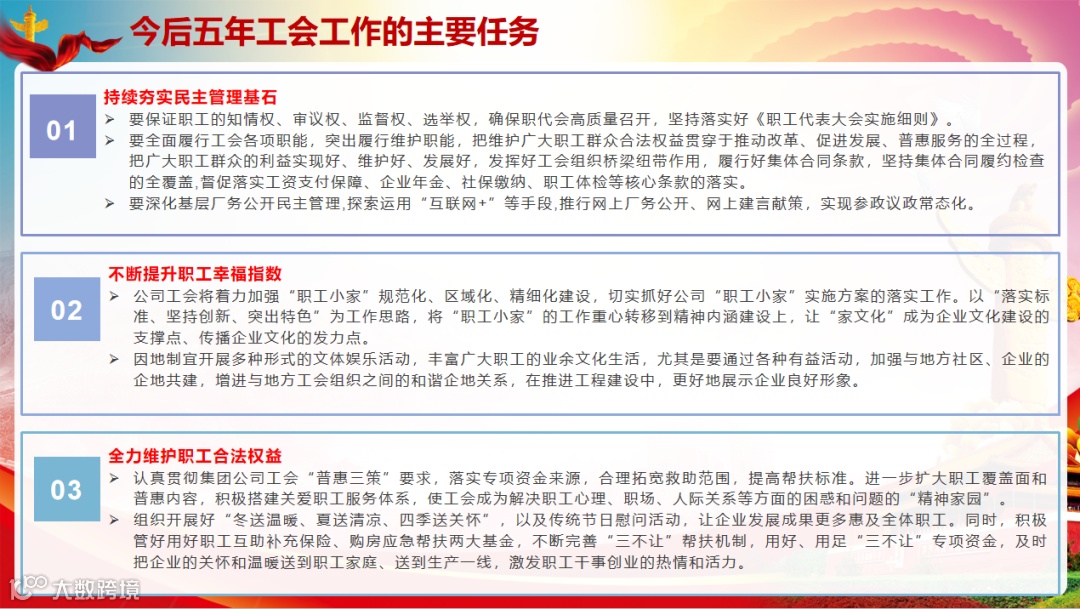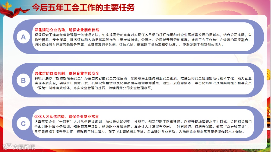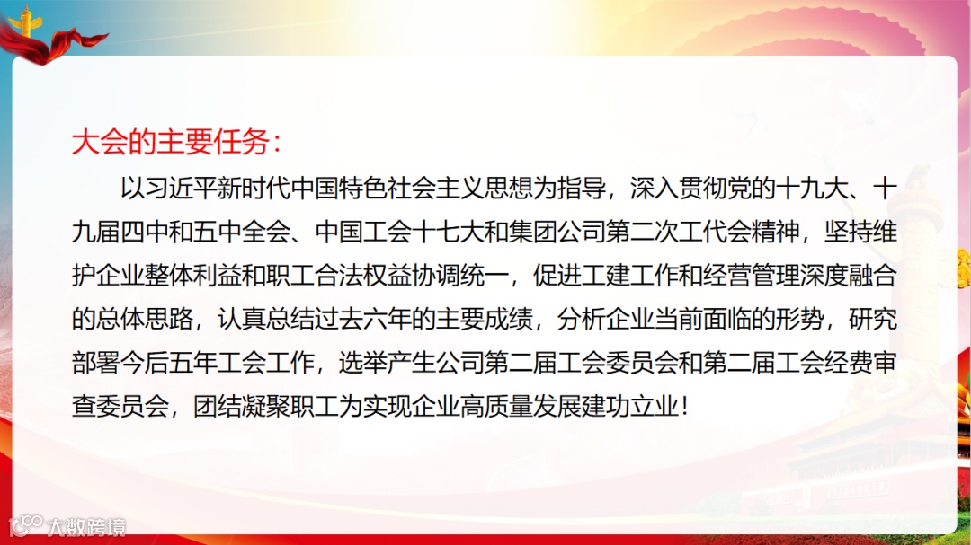 3月1日,中国铁路工会中铁上海工程局集团物资工贸有限公司第二次会员代表大会在沪顺利召开。中铁上海工程局物资工贸有限公司纪委书记、工会主席曲文明在大会上作了题为《坚持“两个维护” 促进深度融合 团结凝聚职工为实现企业高质量发展建功立业》的工作报告。报告总结了第一次工代会以来工会工作的主要成绩和经验,分析了今后一个时期工会工作面临的形势和任务,规划部署了今后五年公司工会工作的思路和要求,强调要夯实企业民主管理基石、做实工建创新融合工作、落实职工普惠关爱措施,切实提升工会组织的服务力、吸引力和凝聚力,团结动员广大职工为实现企业高质量发展建功立业。