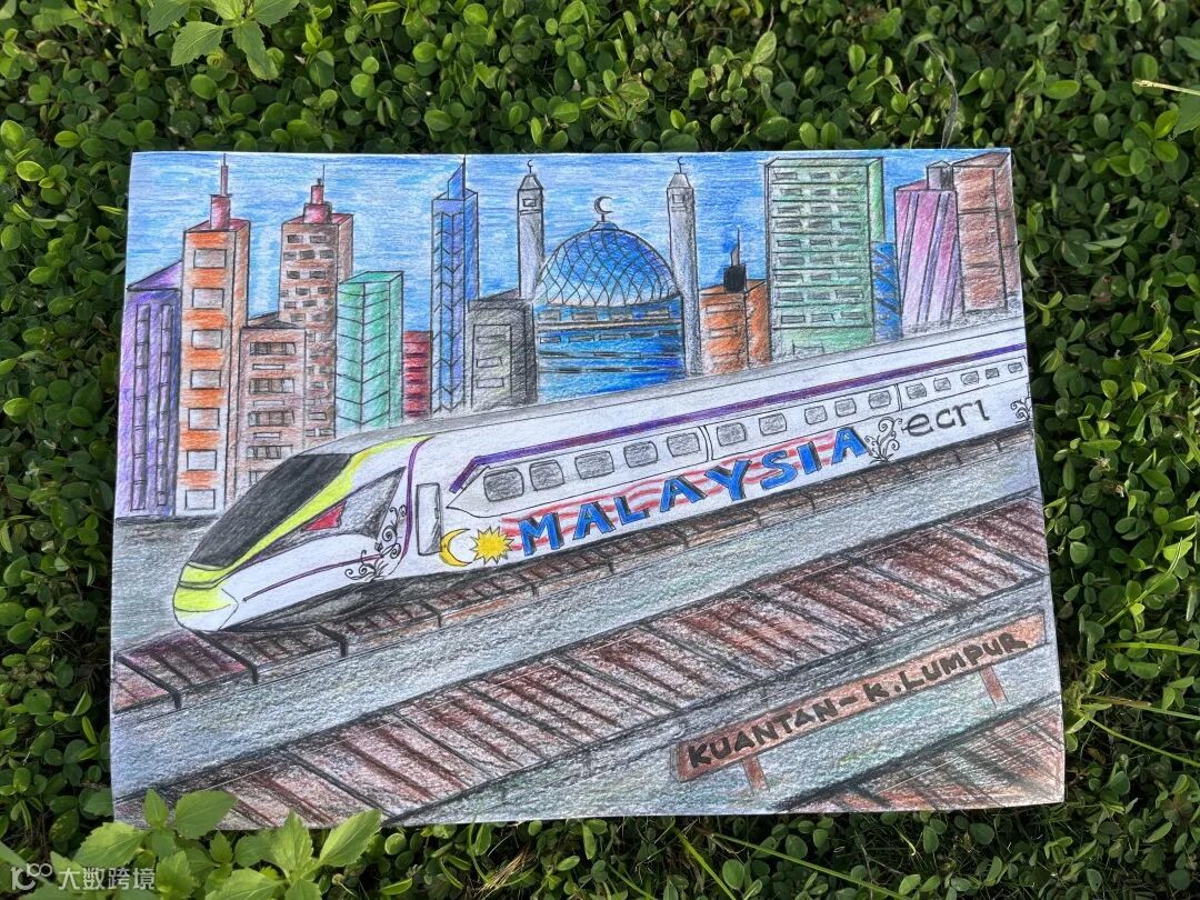 在向大家展示自己的画时,二年级的学生阿莎雅说道:“这是关丹河附近那段正在修建的铁路,旁边这个带着蓝色帽子的小人是我的爸爸,爸爸说过安全官的帽子与其他人的颜色是不一样的,是我非常喜欢的蓝色。旁边画的是挖机、‘肚子非常大,里面会出来混凝土’的大车,还有特别高,可以把一个个‘大墩子’吊上去的大家伙,这些爸爸都给我看过照片,我感到非常的震撼,我长大能不能也去马东铁工作呢?像我的爸爸一样。”