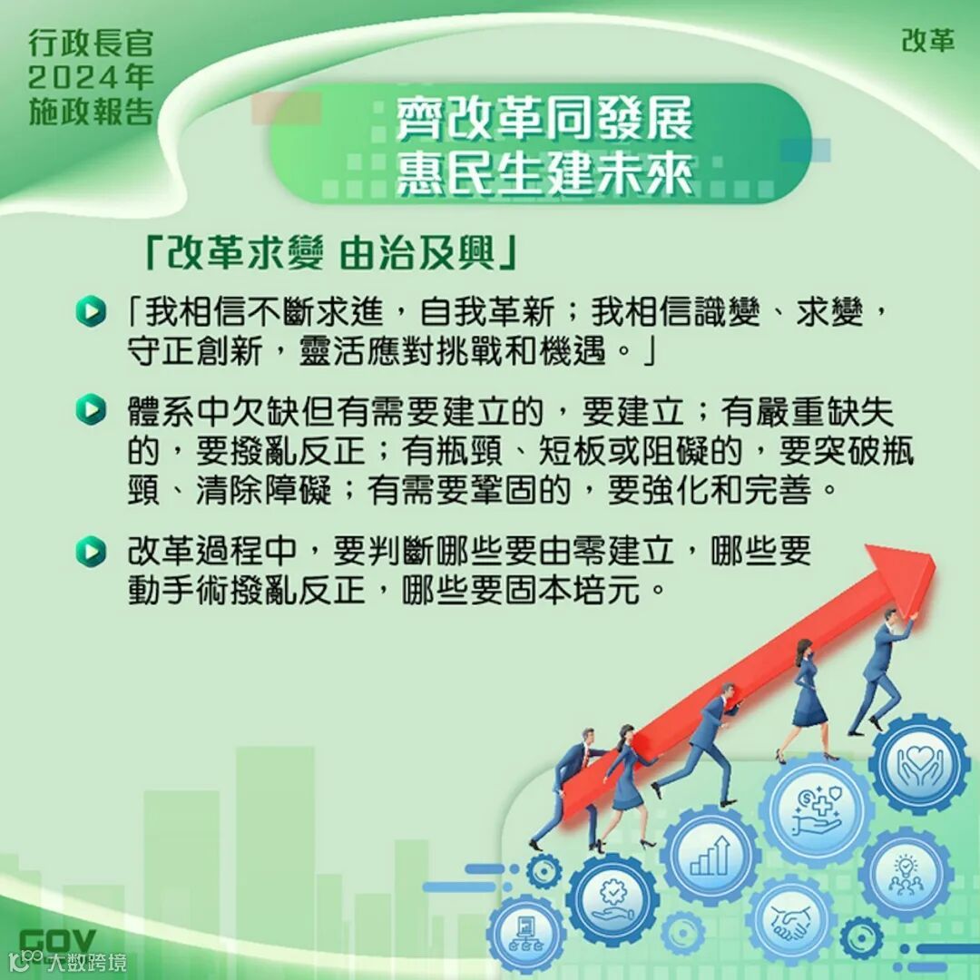 香港特区行政长官李家超昨日(10月16日)发表《行政长官2024年施政报告》,以“齐改革同发展 惠民生建未来”为主题,并继续沿用绿色的《报告》封面,象征和谐、活力、繁荣、新动力和新意念,也寓意特区政府施政的连贯性和持续性,突显香港正迈向“由治及兴”,一个千帆并举、迸发实力的时刻。