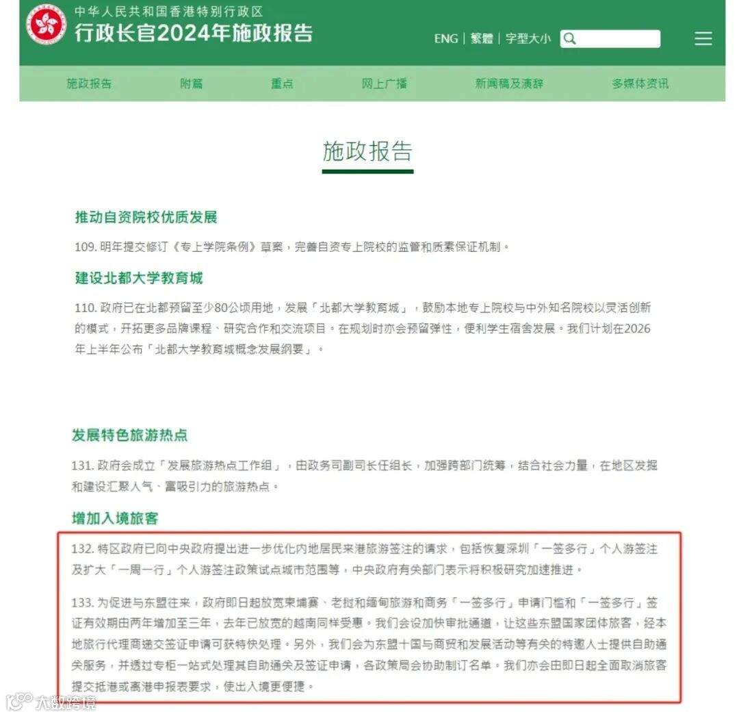 2024施政报告宣布:一签多行;特区政府已向中央政府提出进一步优化内地居民来港旅游签注的请求,包括恢复深圳「一签多行」个人游签注及扩大「一周一行」个人游签注政策试点城市范围等,中央政府有关部门表示将积极研究加速推进。