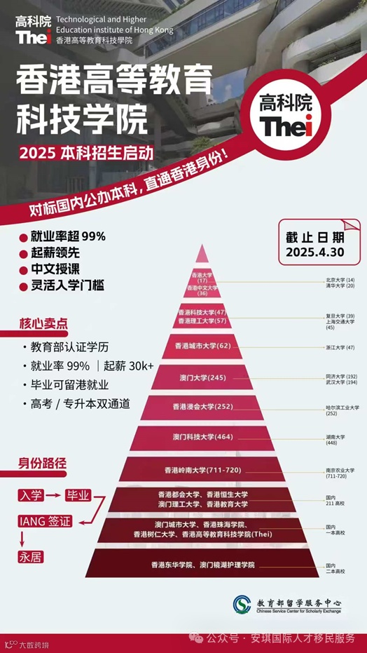 无需高考,学历门槛低,大专、高中、中专院校毕业均可申请,就读期间就可拿到香港身份证,享受香港福利