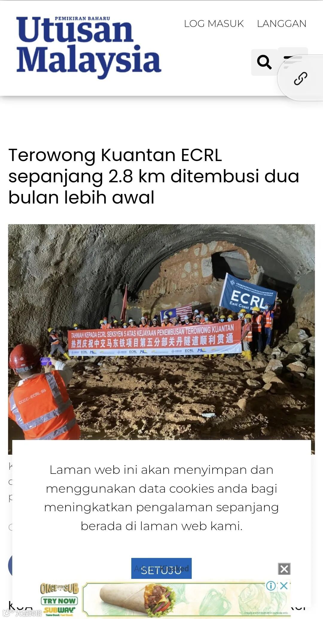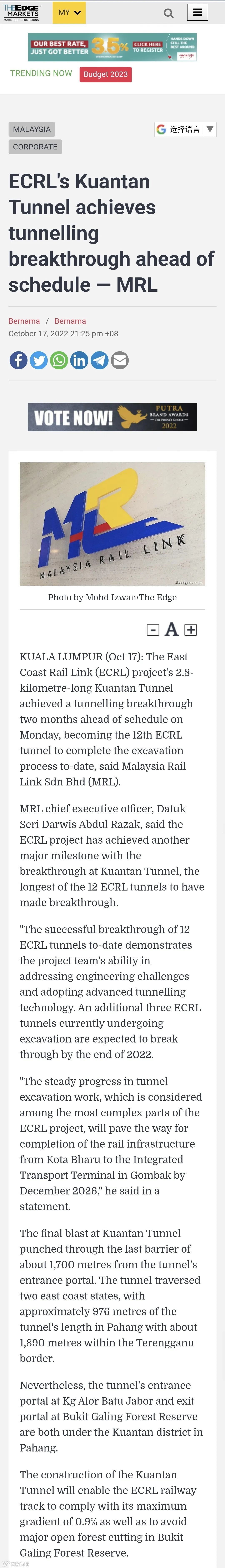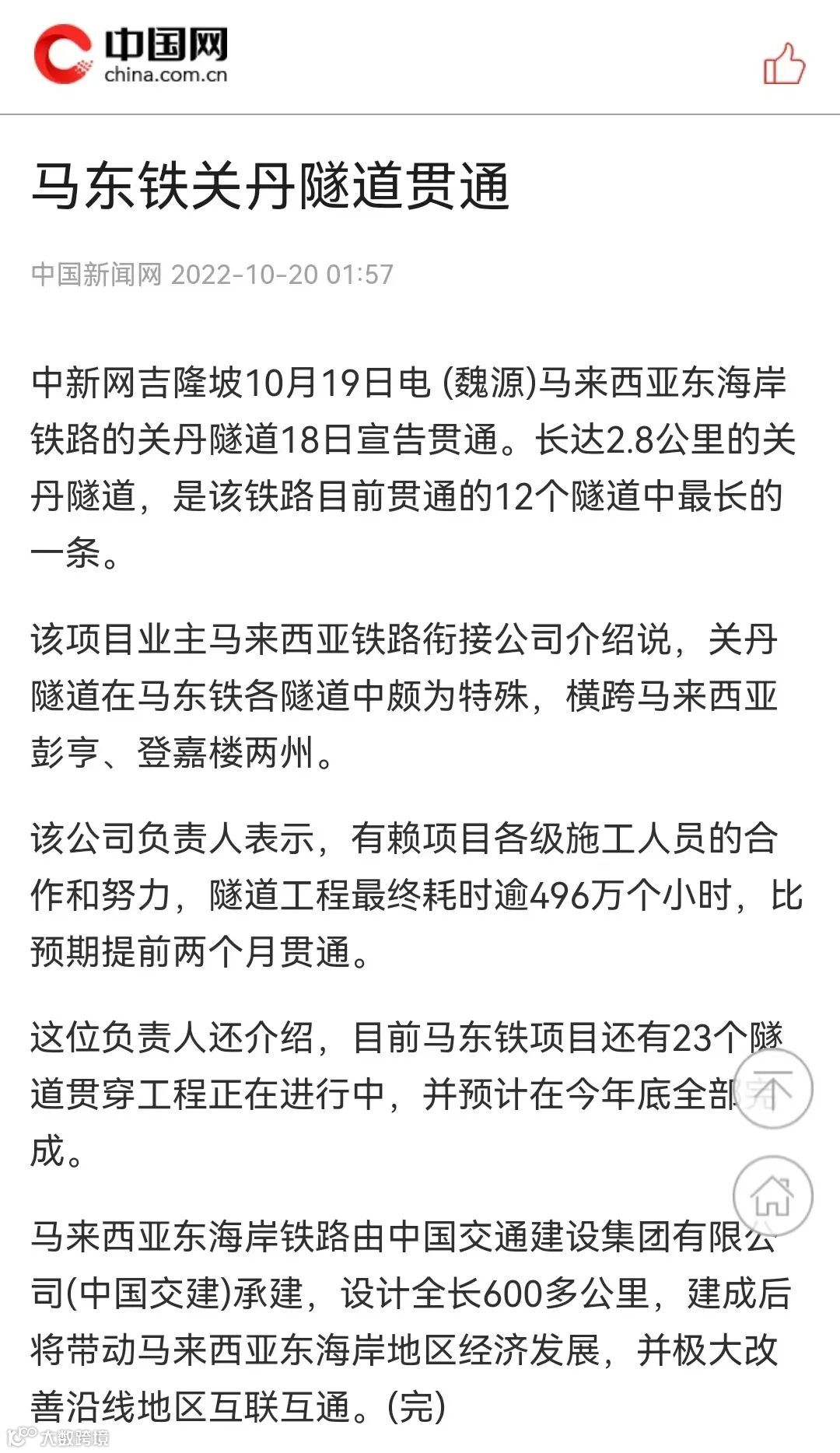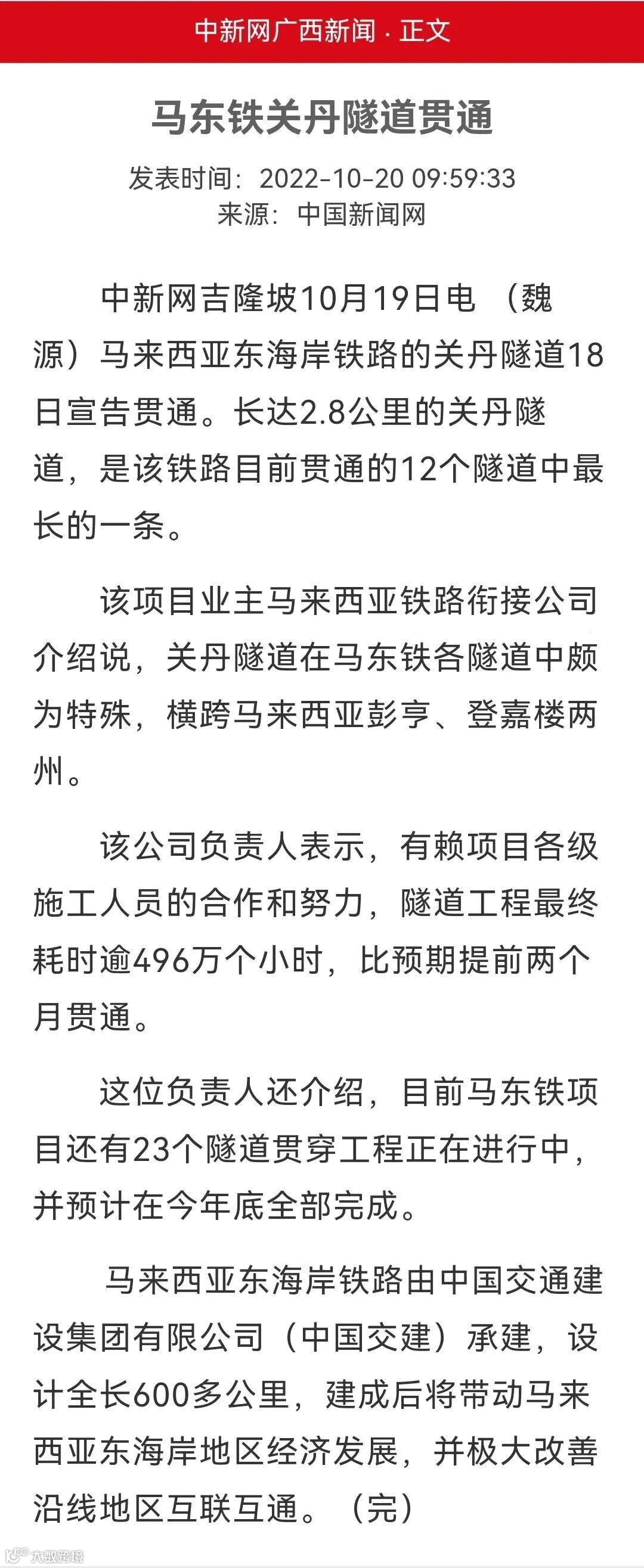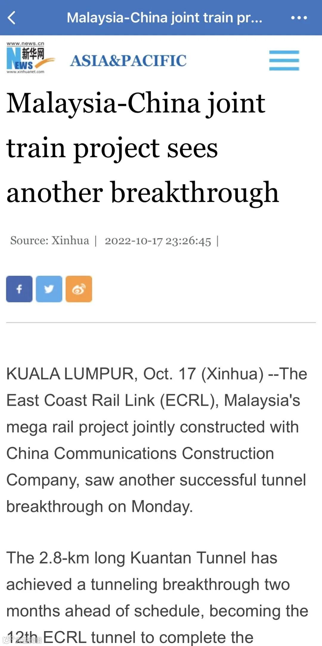 10月17日,中交马东铁项目五分部关丹隧道在历时多年建设后,比预期提前两个月实现贯通,国内外媒体高度关注,新华社英文网、中新网、中国网等国内主流媒体,中国网、The Star、东方网等马来西亚当地主流媒体纷纷发布新闻报道相关情况。