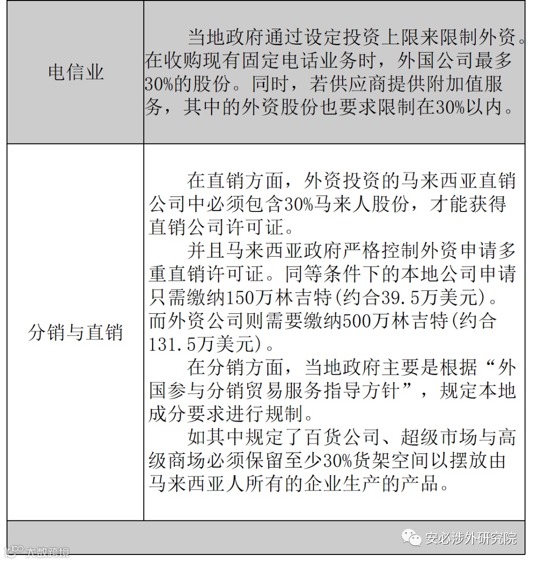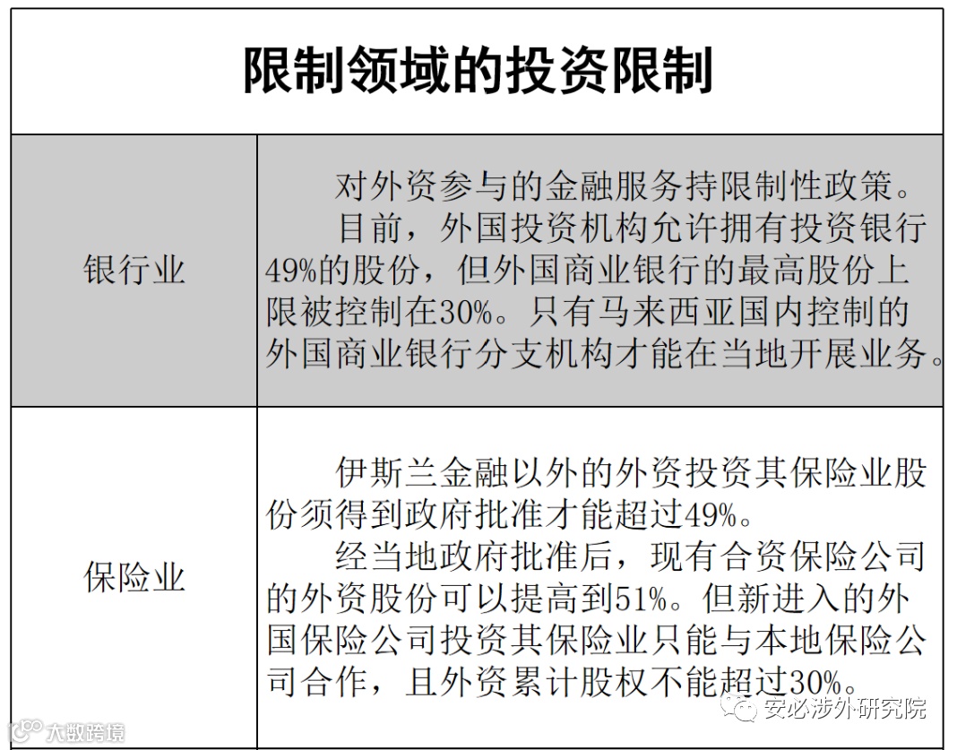尽管马来西亚政府于2009年4月对外资开放了27个服务业领域,并允许外资在与安装电脑硬件相关咨询服务、软件实施服务、数据处理服务、数据库服务、电脑维护和维修服务等相关公司中持有100%的股份,但在鼓励行业以外,也有着银行业、保险业、电信业和分销与直销的投资限制。