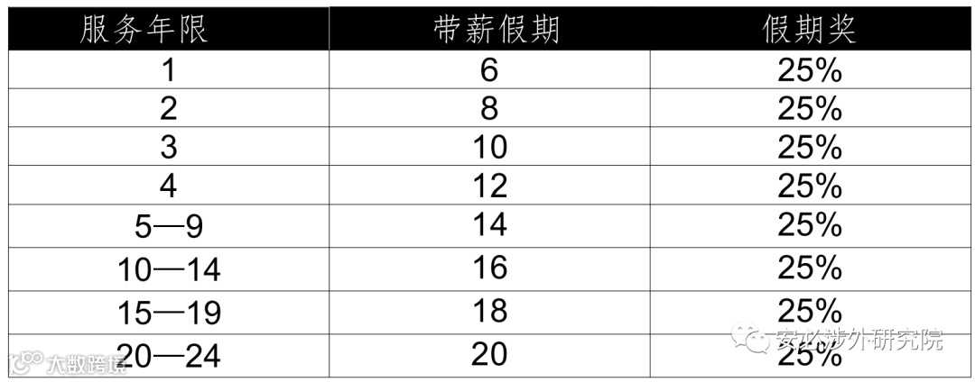 雇员有权享受至少相当于其工资25%的带薪假期,具体如下: