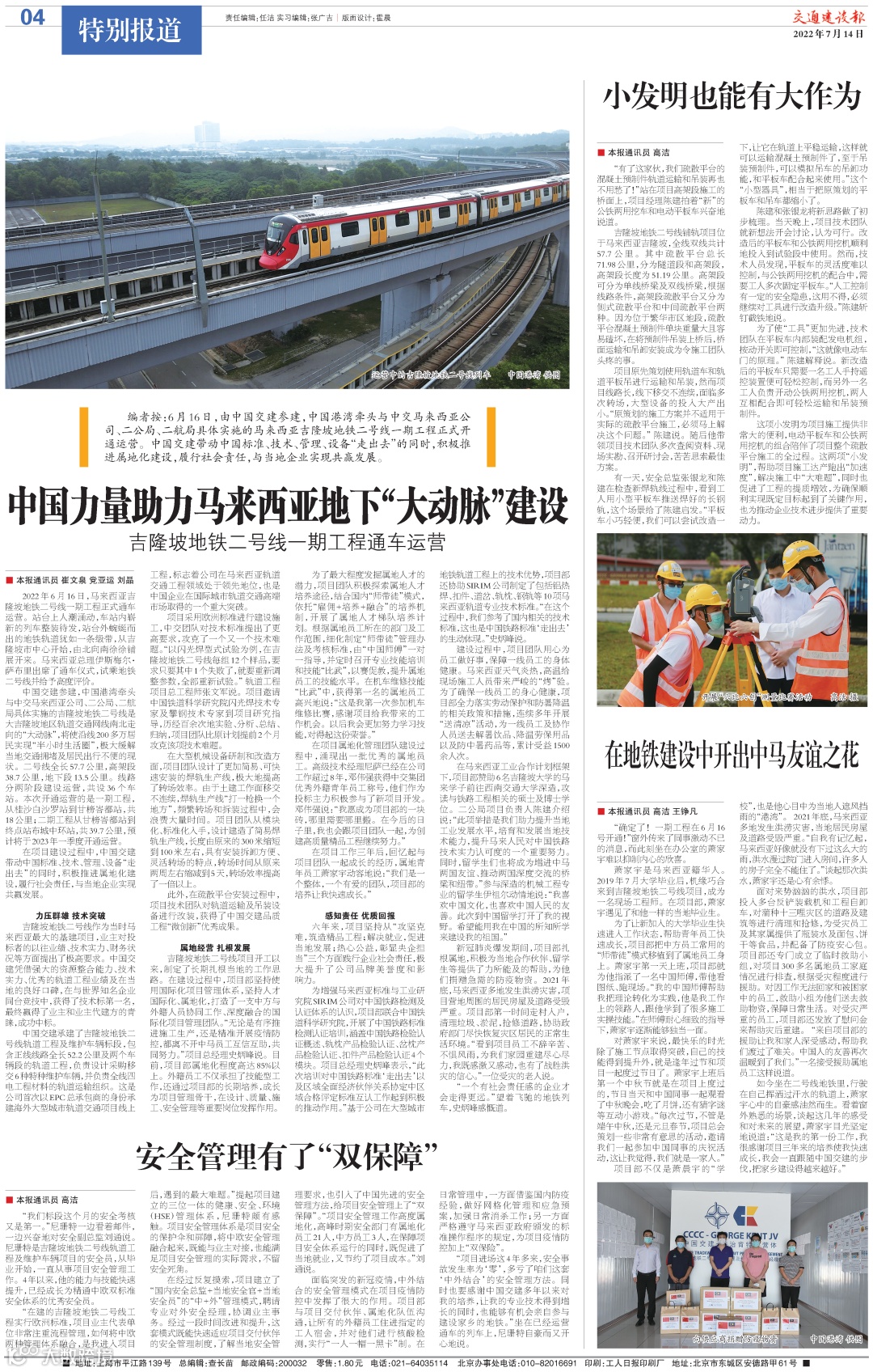 7月14日,《交通建设报》四版以《中国力量助力马来西亚地下“大动脉”建设 吉隆坡地铁二号线一期工程通车运营》为题,专版报道了局参建的吉隆坡地铁二号线一期工程通车运营,现将主稿件全文转载以飨读者。