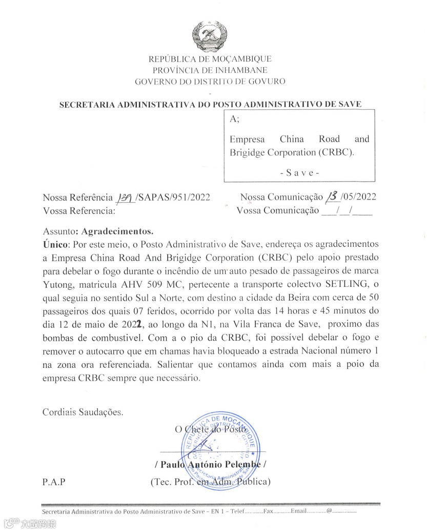 第二天上午,SAVE河镇镇长Paulo一行人来到项目部向项目领导当面递交了感谢信。Paulo表示:“感谢中国救火队!自从SAVE河项目施工以来,同当地政府在治安、防疫等各方面密切配合,多次无偿支援当地政府的各项“救火”工作,特别是在紧急救援、保障交通等方面对改善当地民生发挥了巨大作用。我代表政府对你们长期以来的无私奉献表示感谢和崇高的敬意。”