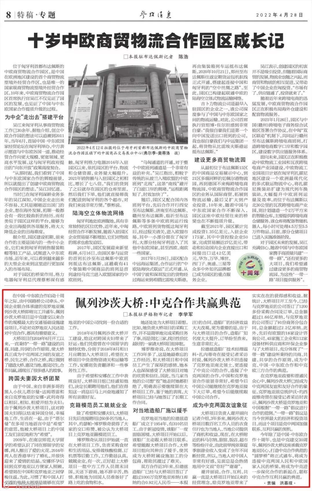 4月28日,《参考消息》特稿版发表专题文章,以克罗地亚佩列沙茨大桥等项目为例,梳理中国-中东欧国家合作重要成果,展望未来广阔发展前景。