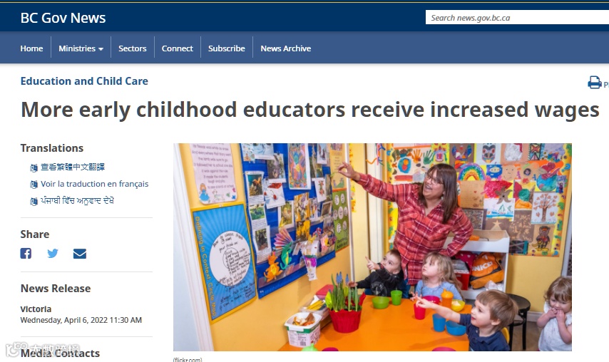 2022年4月1日开始,BC省所有幼教工作者获得4加币的时薪升幅。2021-22年期间,获加薪的幼儿教育工作者超过10,000人。