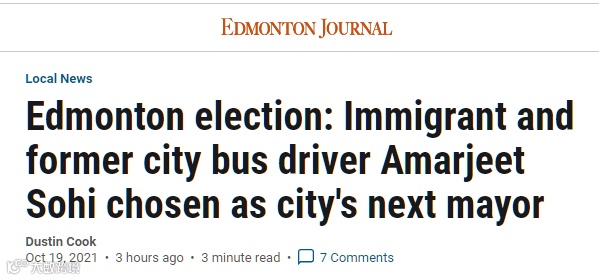 10月18日市政选举胜利是这位57岁的印度锡克教移民取得的又一重大政治成就。他是埃德蒙顿市首位有色人种市长。1982年,18岁的Sohi在哥哥的资助下移民到了埃德蒙顿。