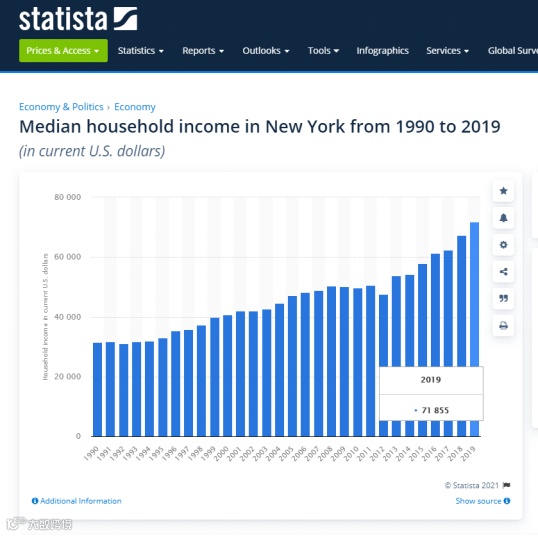 根据美国统计Statista 研究部发布, 2019 年,纽约州的家庭收入中位数为 71,855 美元。2019 年,加州家庭收入中位数为 78,105 美元。