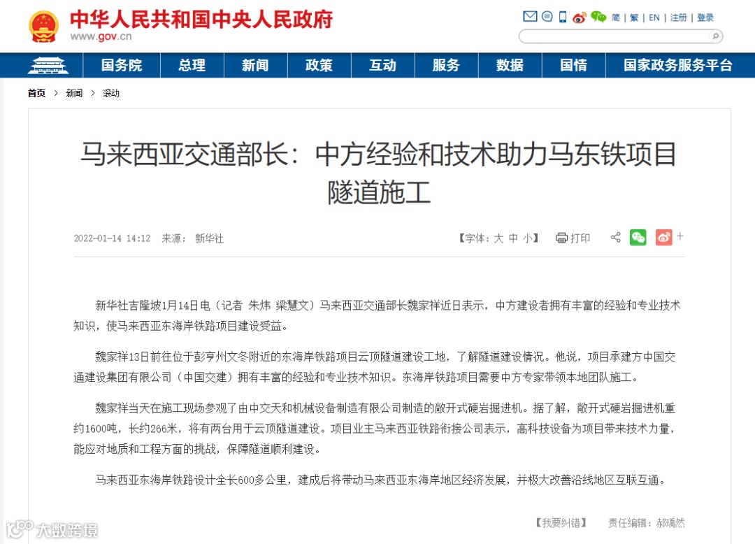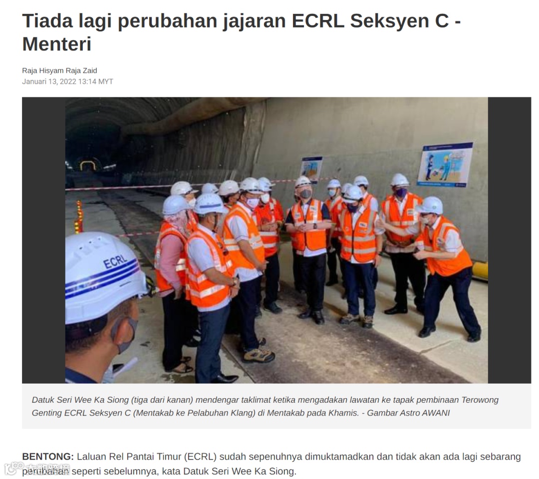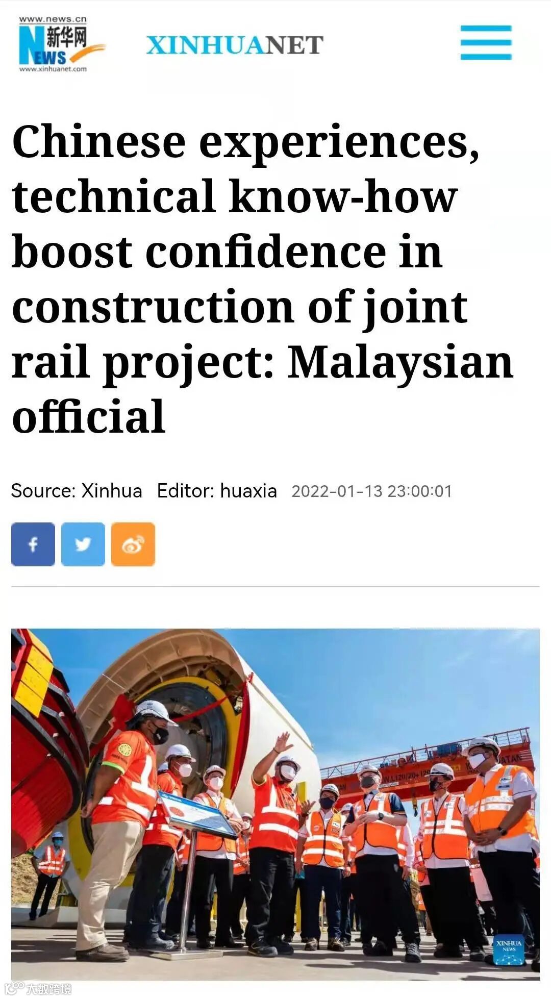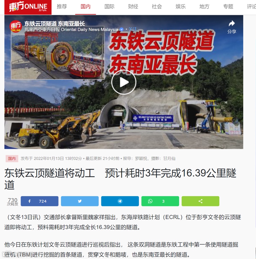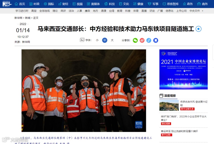 1月13日,马来西亚交通部长拿督斯里魏家祥在中交马东铁项目七分部云顶隧道施工现场召开新闻发布会,对中国交建建设者丰富的经验和专业的技术表示高度认可。