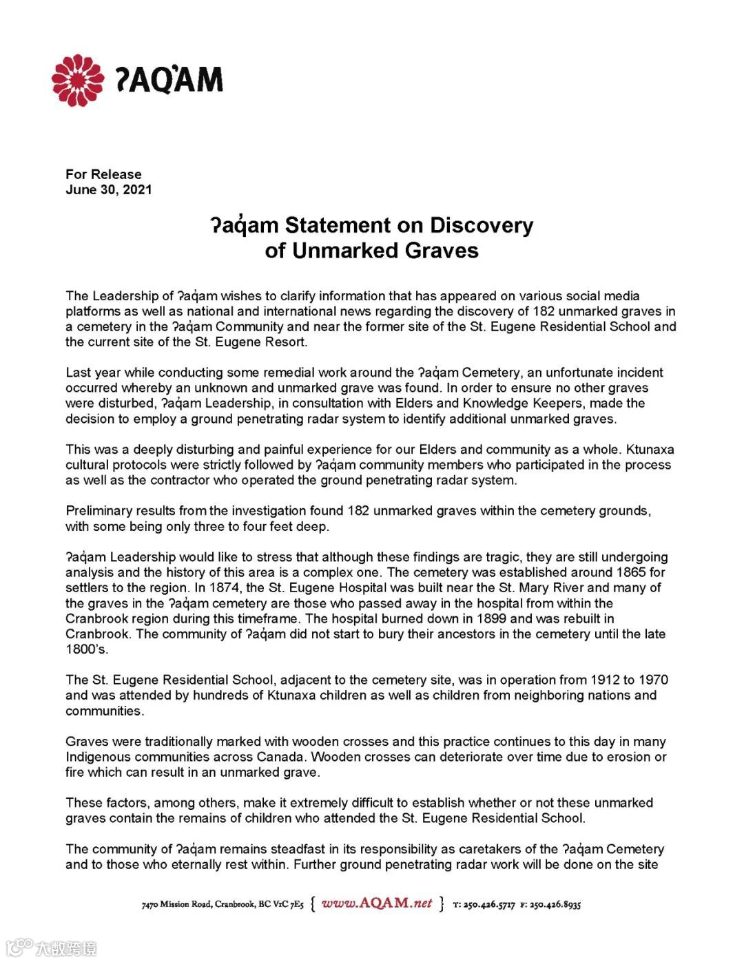 加拿大第一民族社区ʔaq̓am关于发现无名坟墓的声明