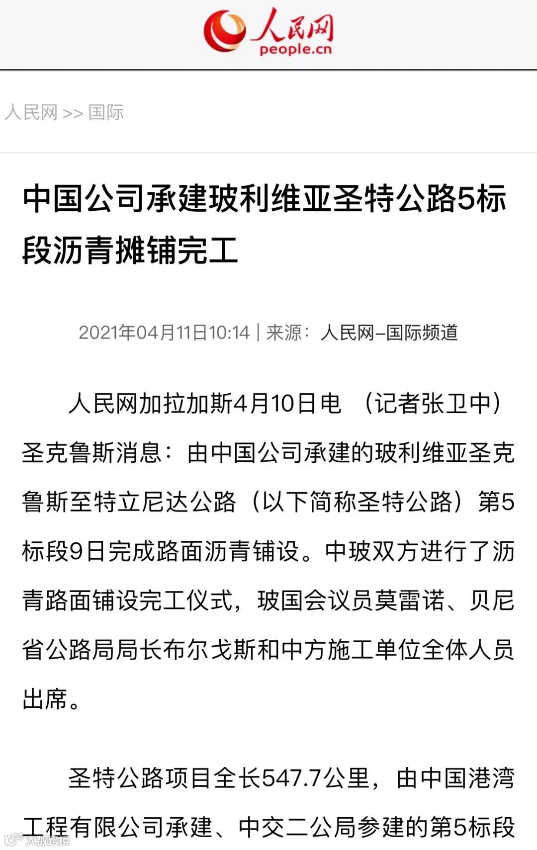 4月10日,人民网发表了《中国公司承建玻利维亚圣特公路5标段沥青摊铺完工》的专题文章,报道了由中国港湾工程有限公司承建的玻利维亚圣克鲁斯至特立尼达公路项目重大节点工程的完成,为后期维养施工奠定了坚实基础,树立了中资企业良好的履约形象。