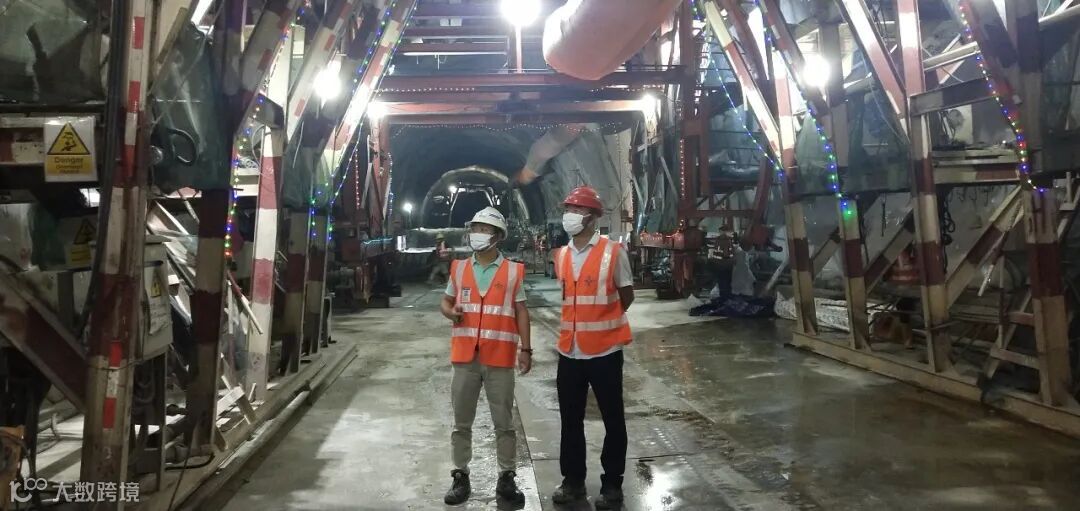 午夜时分,马东铁项目五分部关丹隧道外的森林万籁俱静,白日里的鸟鸣声、猴子的叫声完全没了声息,仅剩不知名的虫子时不时传来鸣叫声,夜空中悬挂的一轮明月照耀着这片陷入沉睡的大地。从天空中向下望去,除了关丹隧道内映出的灯光外,还有两束车灯沿着施工便道向隧道疾驰而去。