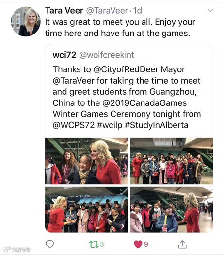 红鹿市市长Tara Veer女士在得知加拿大冬运会首次出现中国学生以MOU官方活动参与者身份出席开幕式现场的消息后,亲自接见各位中国同学,与同学们握手致意,展现了红鹿市乃至艾伯塔省中部对中国同学的无上欢迎。