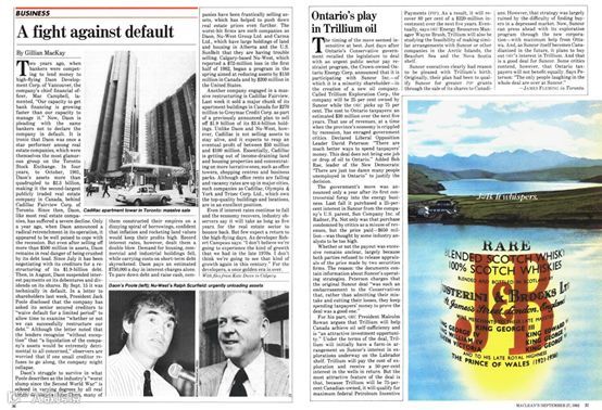 “两年前,当银行家竞相向处于腾飞期的温哥华Daon房地产开发公司贷款时,该公司的首席财务官Mac Campbell感叹道,“我们获得银行融资的增长速度甚至超过了我们管理它的能力。” Daon曾经是房地产公司中的明星,这些房地产公司本身是多伦多证券交易所中最具吸引力的团体。截止1981年10月,在短短四年中,Daon的资产增加了四倍多,达到23亿加元,成为加拿大第二大上市房地产公司,仅次于多伦多Cadillac Fairview公司。