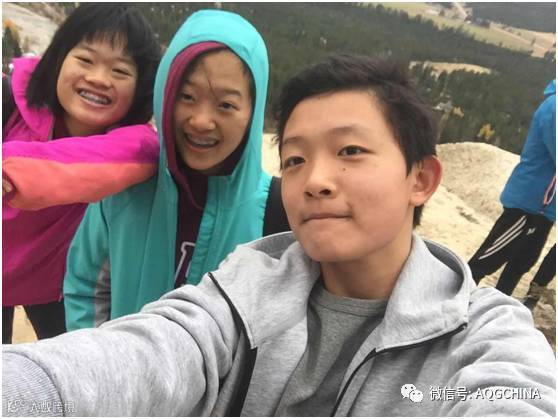 (阮同学跟同行一起去加拿大浸入式体验学习的、来自广州市华侨外国语学校的2名学生也做了好朋友,他们都是在金伯利市内的学校学习,他们会在校车相遇、在校车上分享自己遇到的人和事,社区活动也经常会碰到,图为教育局组织的徒步旅行时的合照)
