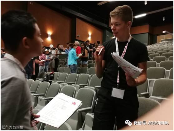 (图为阮同学在新生欢迎会上与来自德国的国际生交谈,教育局南区负责人Ulli老师给每个学生现场发小作业材料,材料列举了15个采访型问题。学生需要问不同的学生这些问题,让其他学生在你自己的试卷上写上问题答案和签字,这意味学生想要完成这15个问题,需要主动找至少15个其他国家的学生采访和讨论,才能完成试题。在完成作业的同时结交来自世界各地的朋友。)