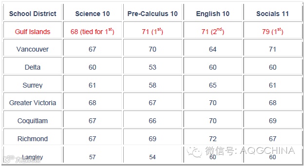教育部每年都会发布有关BC省内K-12年级学生的学术表现报告。其中一项测量是政府规定的必修课程的综合考试成绩。鉴于海湾岛教育局相对较少的学生数量,这项数据能提供更准确的比较依据,有助于我们了解其如何有效地帮助学生为毕业和进入大学做准备。下表比较了最近一次政府组织的必修课程考试的教育局成绩排名。表中数据表示在必修课程考试中取得C+或以上成绩的学生比例。与其他大城市教育局比较,最近一次报告显示海湾岛教育局在微积分入门10,社会学科11和科学10 的科目中排第一,在英语10上排名第二且与第一名只相差1个百分点。所以大的不一定意味着更好。