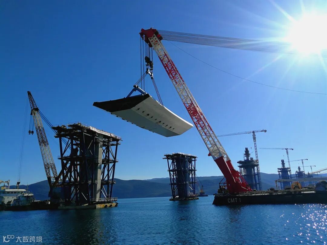 近日,在业主、监理及当地媒体等各方的共同见证下,1000吨浮吊将重约750t的SS3钢箱梁稳稳地吊装在S3号墩支架顶面,标志着克罗地亚佩列沙茨大桥及连接线项目首片墩顶大节段钢箱梁顺利架设成功!