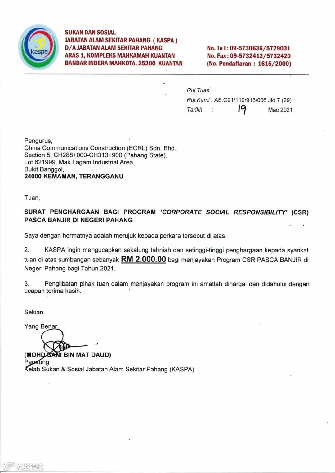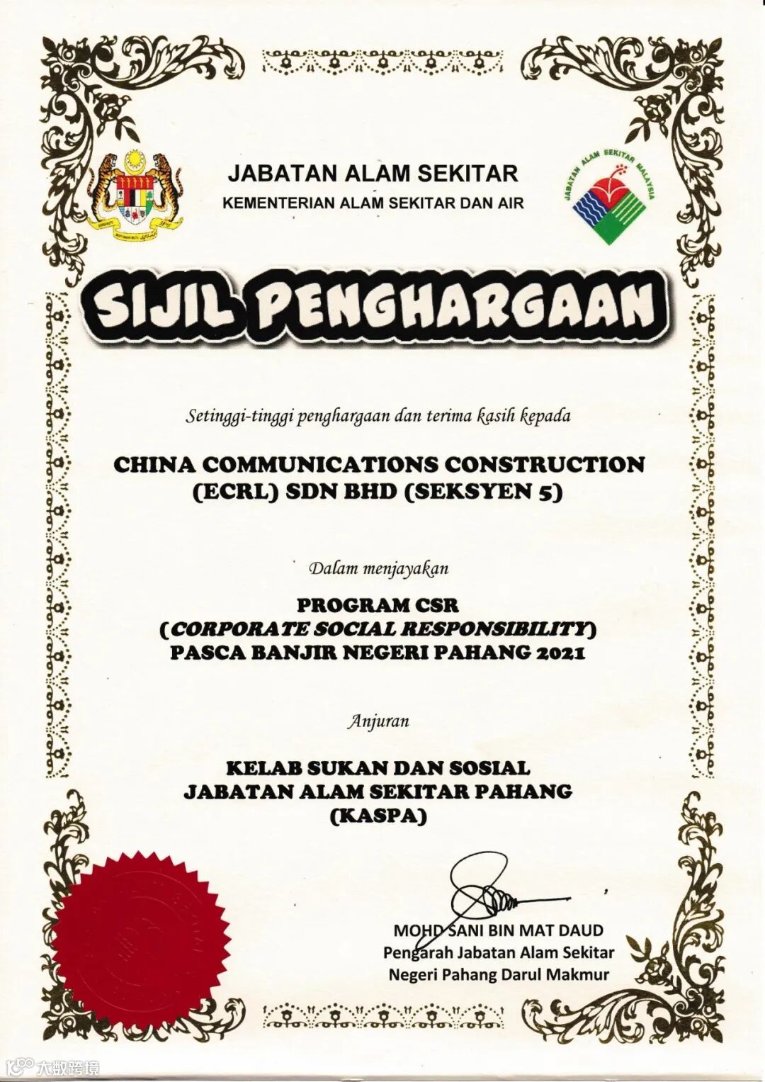 4月1日,中交马东铁项目五分部收到彭亨州环境局发来感谢信和感谢奖状,对项目在彭亨州抗洪救灾活动中所付出的努力表示感谢,对中资企业积极履行社会责任的行为表示肯定和赞赏。
