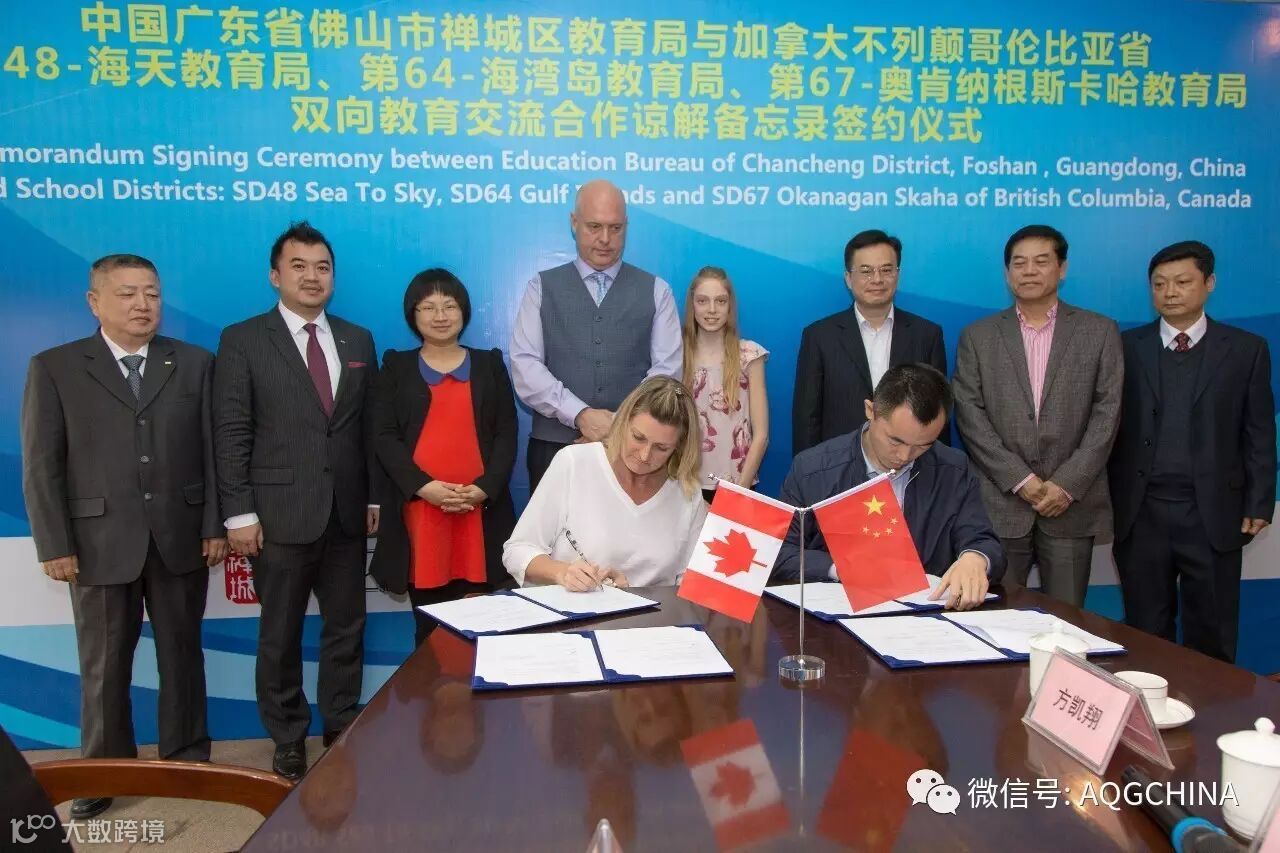 2017年3月27日在广东省教育厅、佛山市教育局、佛山市禅城区区政府、禅城区外事侨务局等相关领导的见证下,加拿大海天教育局局长Lisa女士代表BC省第四十八海天教育局、第六十四海湾岛教育局和第六十七奥肯纳根斯卡哈教育局正式与广东省佛山市禅城区教育局签署双向教育交流合作谅解备忘录