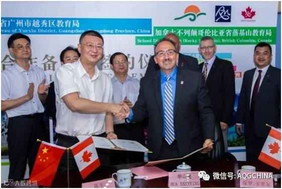 在广东省教育厅国际交流处处长李金俊、广州市教育局主任督学华山鹰等领导的见证下,越秀区教育局隆重举行了与加拿大不列颠哥伦比亚省第六教育局——落基山教育局的《双向教育交流促进合作谅解备忘录》签署仪式,正式启动了越秀区教育局与落基山教育局中加教育局战略合作。