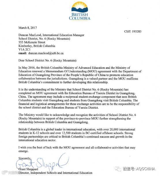 该BC省教育厅公函编号为193283,重申了两省备忘录的精神,肯定并支持越秀区和落基山教育局签署备忘录的具体项目合作。BC省教育厅表示5月份来访广东省的18名中学生不仅仅是落基山教育局的学生,而是BC省和广东省备忘录框架协议下首批来穗交流的BC省优秀中学生代表,该交流活动得到双方政府教育部门的监督和支持。