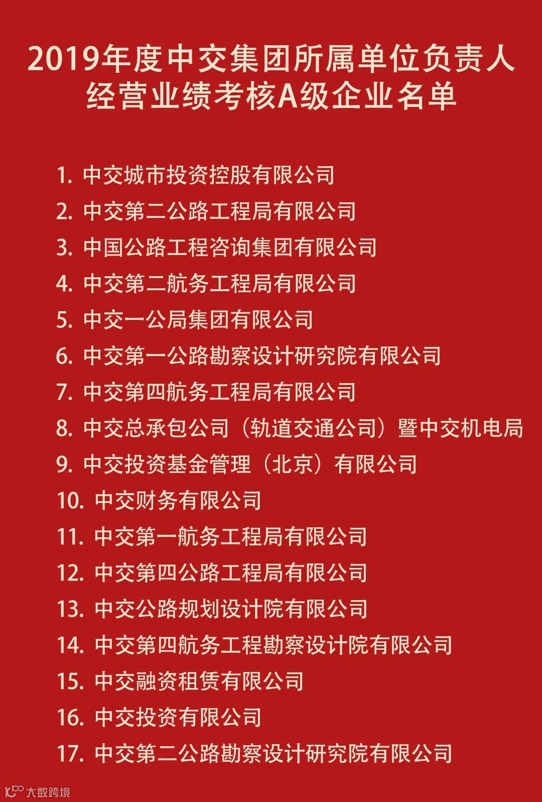 根据《中交集团所属单位负责人经营业绩考核办法》(中交股运发〔2016〕275号)和《关于印发中交集团所属单位负责人经营业绩考核办法配套文件的通知》(中交股运发〔2016〕272号),2019年度中交集团所属单位负责人经营业绩考核结果已经中交集团2020年第八次集团办公会议审议通过,现将A级企业名单通报如下: